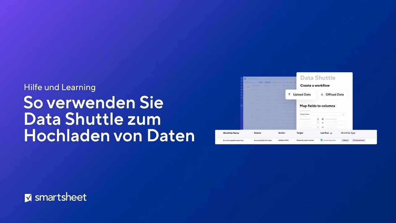 Wenn Sie Zugriff auf Smartsheet University haben, finden Sie diese Informationen mit interaktiven Anleitungen im Kurs Data Shuttle-Hochlade-Workflows.