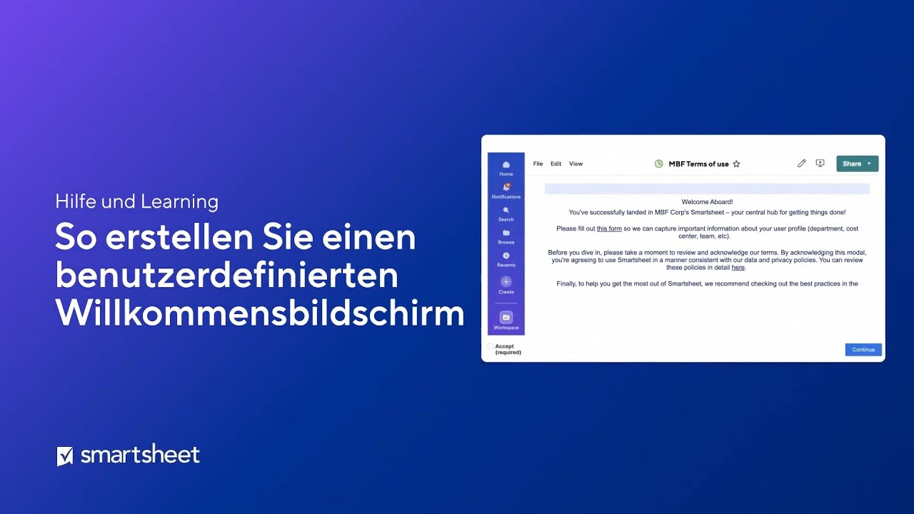 Der Willkommensbildschirm wird allen neuen Benutzer*innen, die zum Enterprise-Plan eingeladen werden, beim ersten Anmelden bei Smartsheet angezeigt sowie allen bestehenden Benutzer*innen beim nächsten Anmelden. Sie können den Willkommensbildschirm zur Anzeige der internen Bedingungen für Ihre Benutzer*innen verwenden, damit diese die Bedingungen vor dem Fortfahren akzeptieren müssen.