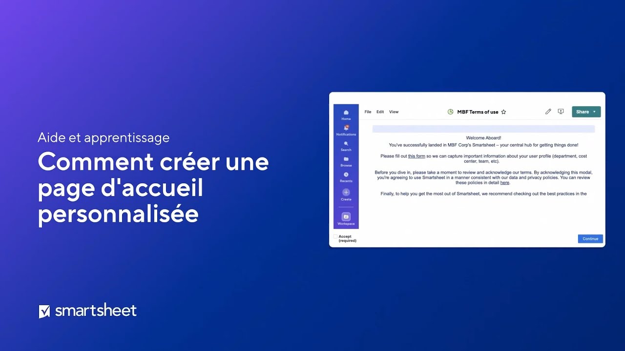 Cochez la case L’utilisateur doit cliquer sur Accepter, si nécessaire. Une fois la case cochée, vos utilisateurs doivent cocher une case indiquant qu’ils ont pris connaissance des informations de l’écran d’accueil avant de poursuivre dans Smartsheet.