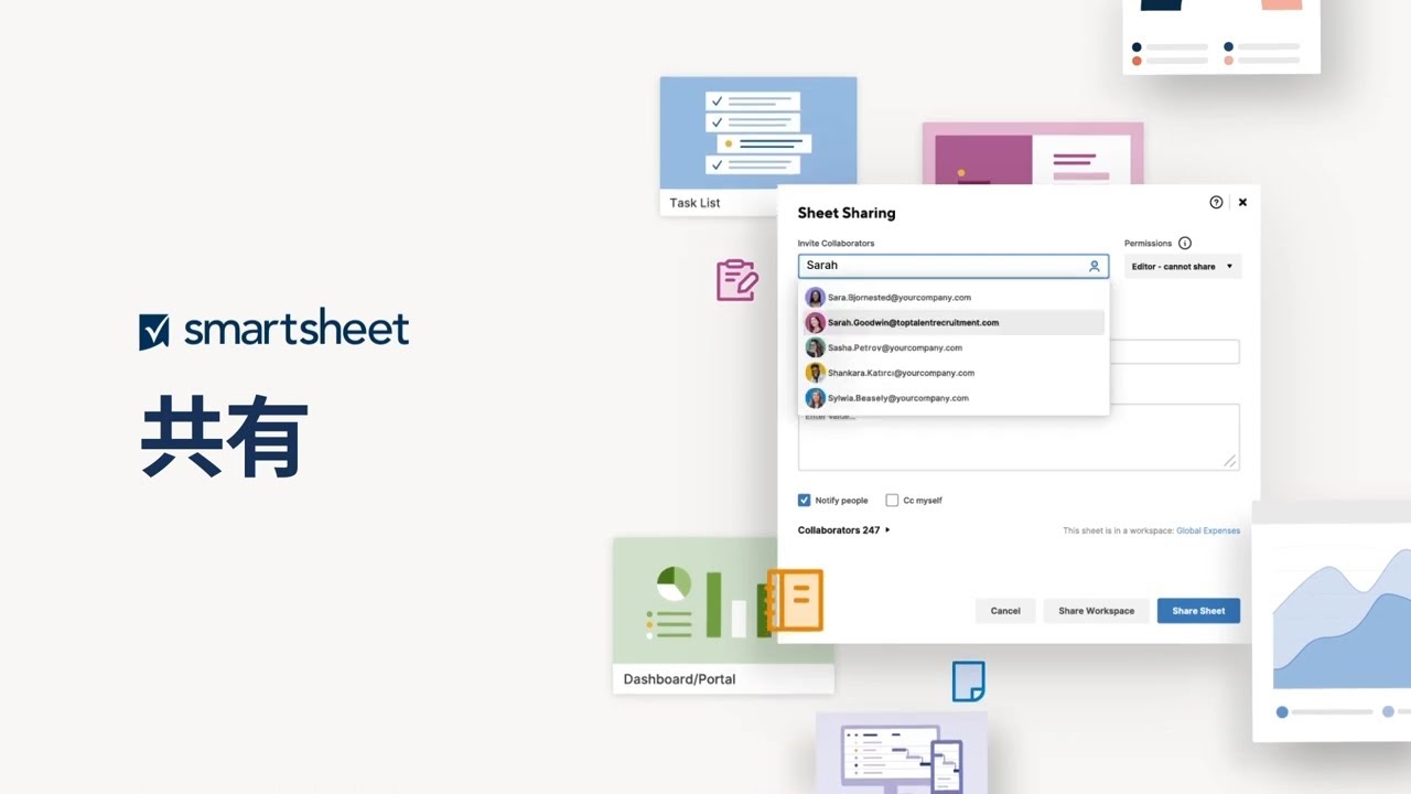 共有は Smartsheet の中心機能です。この機能により社内外の関係者は、適切なユーザーが更新した最新情報を適切なタイミングで確認できます。シート全体または一部のみを共有したり、ユーザーごとに管理権限レベルを設定して、共有ユーザーの使用機能を管理したりすることが可能です。